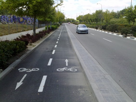 La separación con el tráfico rodado es mediante un bordillo sin más; con los peatones, lo que lo separa es una pantalla vegetal. Ambas soluciones muy estéticas además de principalmente seguras.